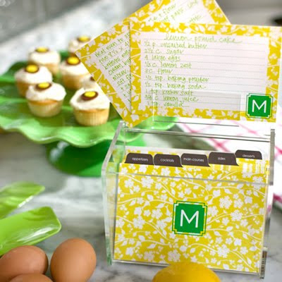Prepare dinner in style with this personalized recipe cards and box set from the Dabney Lee At Home collection. Organized by course, 50 monogrammed and lined recipe cards remain clean from ingredients in a clear lucite box while adding a pop of color to a kitchen counter. Choose from Dabney Lee’s signature patterns adding a monogram or name plate from the styles in the color of your choice.