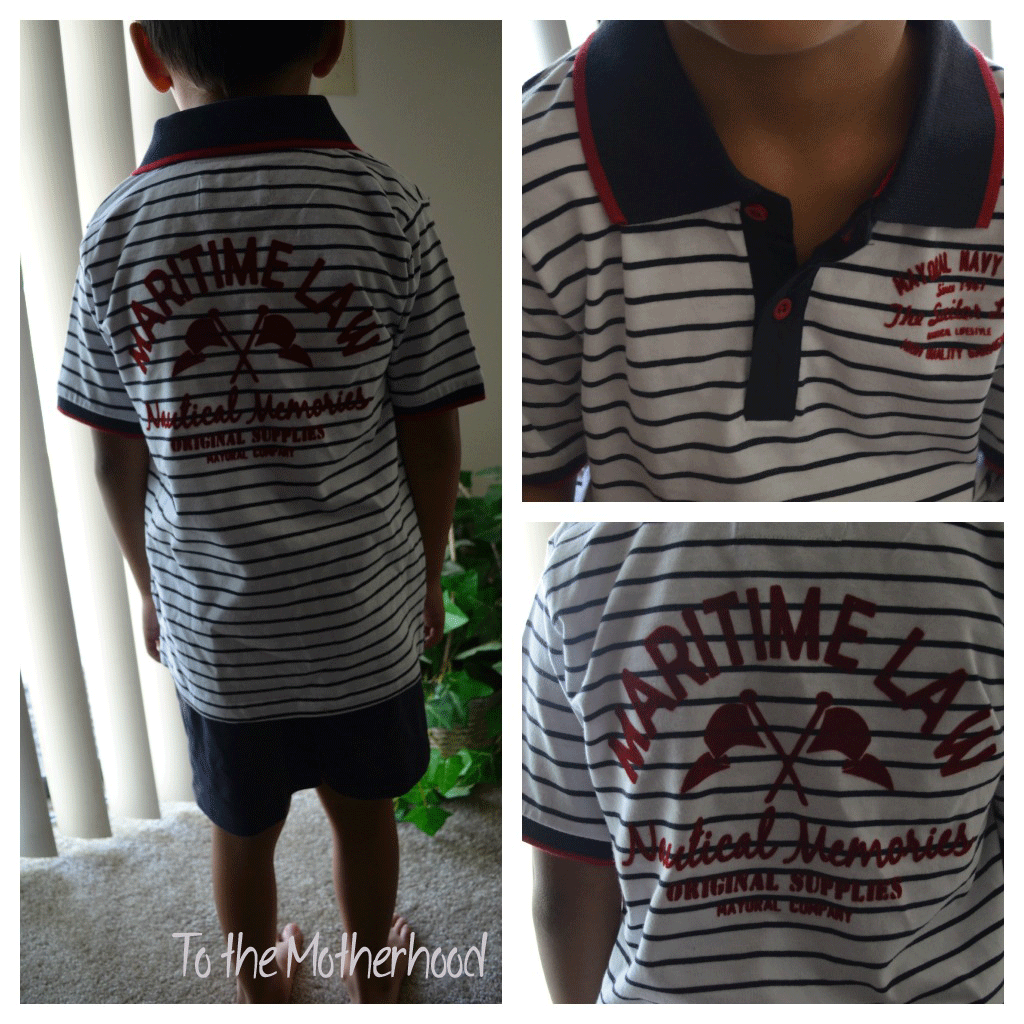 My son received the stately Nautical Polo Short Set ($39), which is perfect for any balmy weather adventure. The navy and white stripe polo features red boating-related raised insignia on the front and across the back. The collar and sleeves are uniquely distinctive with their navy ribbing trimmed in red. The three button placket front is nicely contrasted and the red buttons pull the look together. The soft and stretch jersey cotton is beautifully accented with red welting at the pockets and navy and white tie braid at the front waist.
