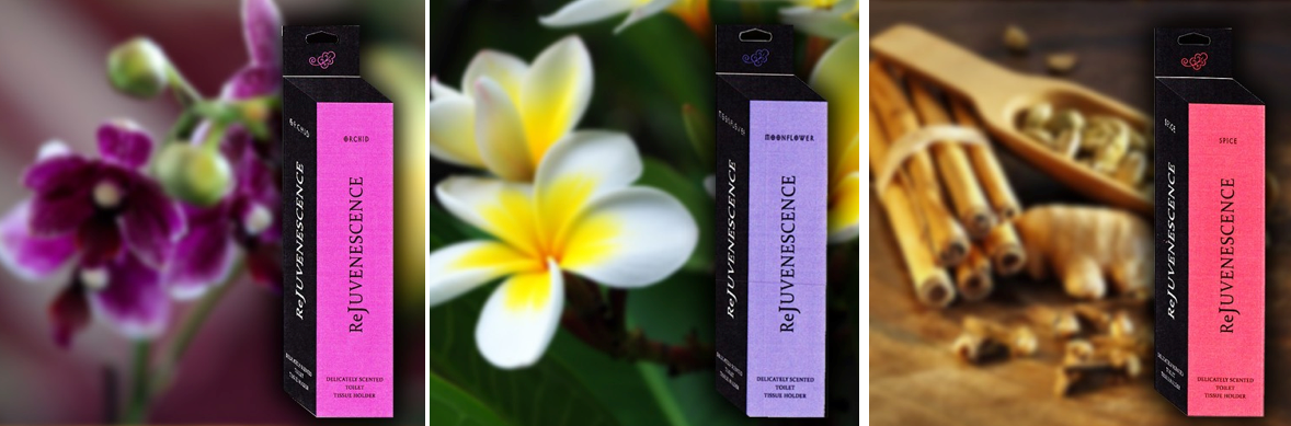 ReJuvenesence is a patented new line of scented toilet tissue holders specially designed to mask unpleasant odors and leaves your bathroom smelling great! The fragrance is diffused when the roller is set in motion. The long-lasting scented oils inside ReJuvenescence are made from 100% natural essential oils and include no additives. ReJuvenescence is made in the USA from recycled material.